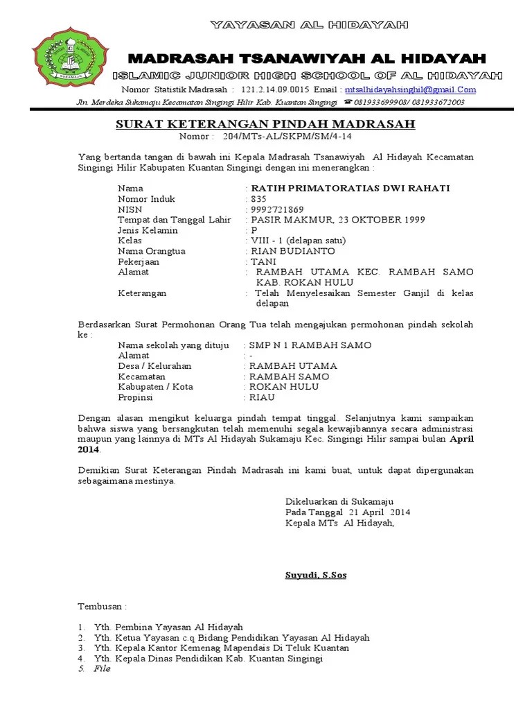 Seperti contoh surat rekomendasi pindah sekolah antar provinsi, syarat pindah sekolah antar kabupaten, cara pindah sekolah dari smp ke mts, cara . Baik surat permohonan pindah dari orang renta siswa, surat keterangan pindah sekolah dari madrasah asal maupun surat keterangan telah menerima siswa pindahan. Sesuai surat permohonan pindah sekolah yang diajukan oleh orangtua/wali murid*) . Yayasan al ikhlas negarayu mts al ikhlas alamat: